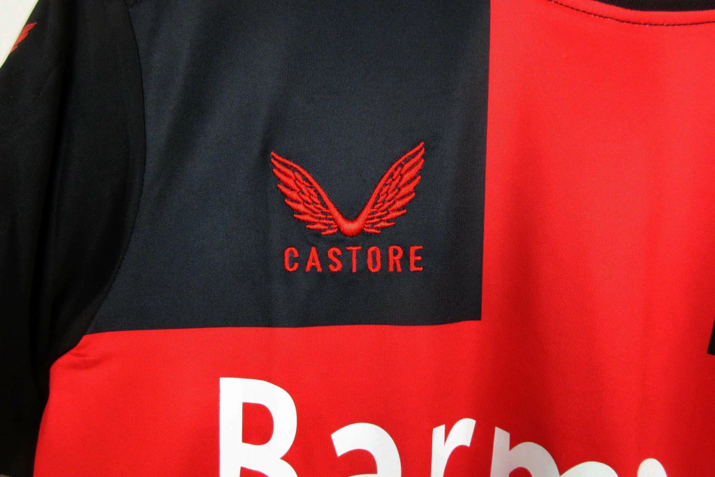 A nova camisa titular do Bayer Leverkusen é predominantemente preta e tem como destaque uma cruz vermelha centralizada na região frontal do corpo, que faz referência ao logo da Bayer, presente no escudo do time. A gola redonda e os punhos são pretos e trazem finas linhas cinza, enquanto a nuca traz o apelido “Werkself” em vermelho. O escudo do Bayer está no lado esquerdo do peito, numa versão preta e vermelha, enquanto o logo da Castore aparece no lado direito e nos ombros em vermelho. O patrocínio máster da Barmenia é aplicado em branco, dentro da cruz.