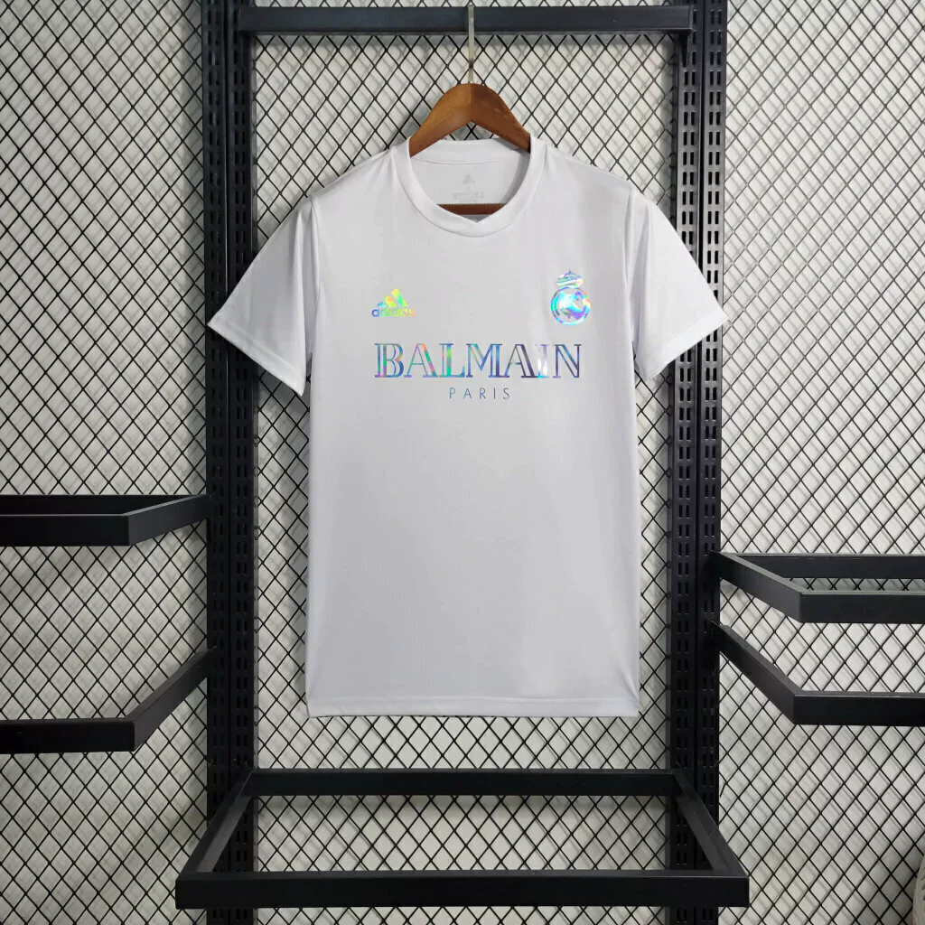 camisa refletiva real madrid branca, aonde comprar camisa refletiva do real madrid branca, camisa refletiva real madrid 23/24, camisa refletiva balmain 23/24