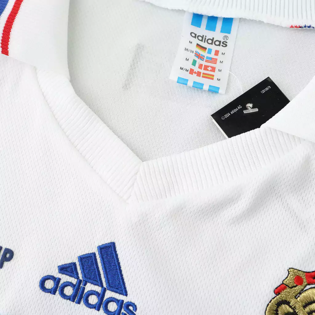 A camisa retrô manga longa da França branca, modelo reserva de 1998, é uma peça icônica que remete à vitória histórica da seleção francesa na Copa do Mundo de 1998. Este uniforme clássico é ideal para colecionadores e apaixonados por futebol, proporcionando estilo e nostalgia em um design que marcou época.