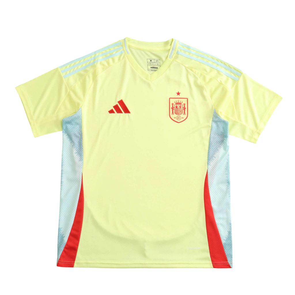 A camisa reserva da seleção espanhola para a temporada 2024/2025 é uma peça de destaque, apresentando um design inovador que combina tradição e modernidade. Com a cor amarela como base, a camisa possui detalhes em vermelho e dourado, representando as cores da bandeira espanhola. O escudo da Real Federação Espanhola de Futebol está em destaque no peito, enquanto elementos gráficos sutis adicionam um toque contemporâneo à peça. Esta camisa é uma representação visual do orgulho e da paixão do país pelo futebol.