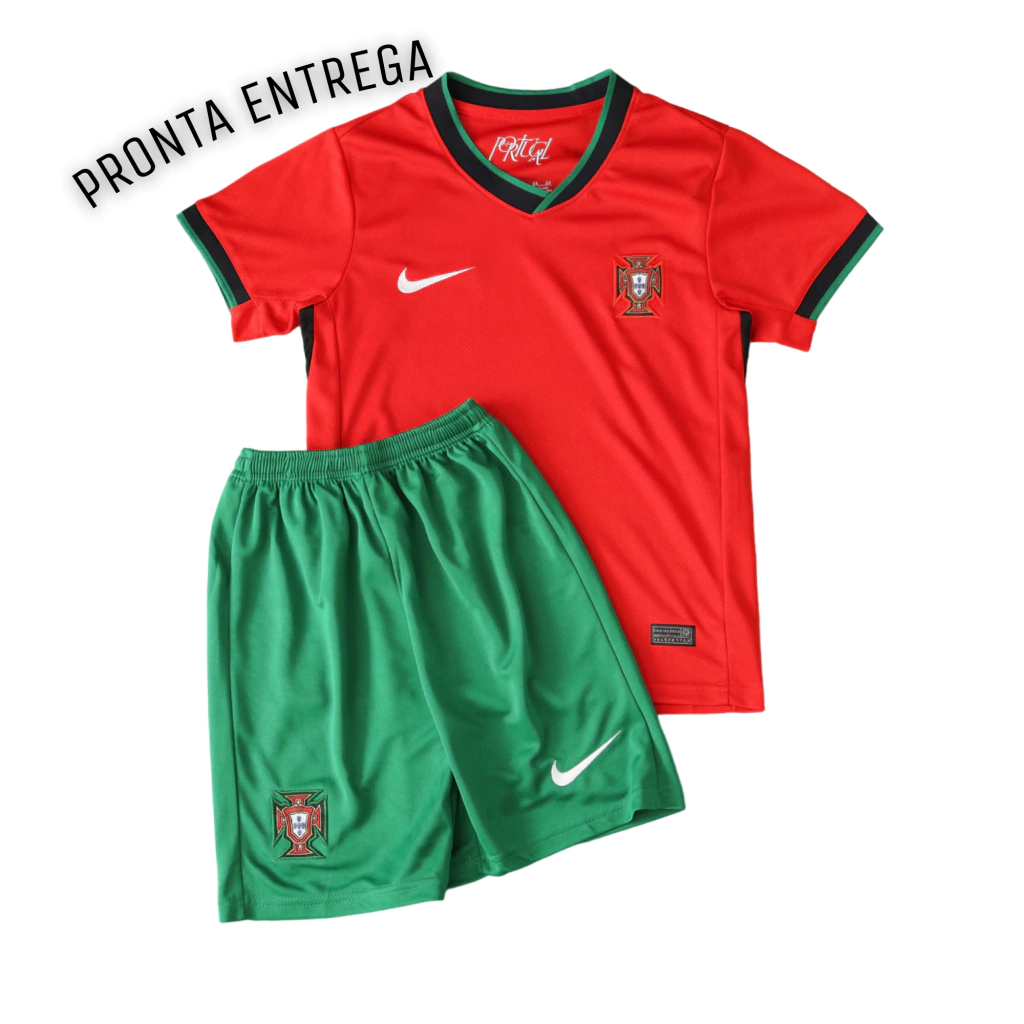 Compre a camisa infantil e kit infantil de Portugal, temporada 24-25, pronta entrega! Inspirado nos craques da seleção portuguesa, este conjunto oficial é ideal para os pequenos fãs de futebol. Disponível em todos os tamanhos infantis, com conforto, durabilidade e o design autêntico da equipe nacional. Perfeito para jogos, treino ou dia a dia.